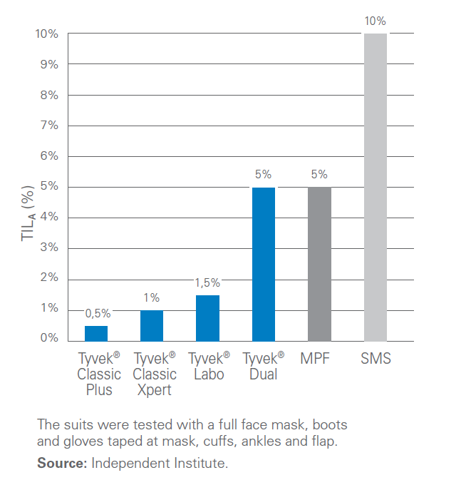 Total Inward Leakage: When comparing their barrier performance of DuPont™ Tyvek® Type 5 coveralls with other Type 5 suits made of Microporous Film (MPF) and SMS (Spunbond/Meltblown/Spunbond), the models made of Tyvek® show a significantly lower Average Total Inward Leakage (TILA) according to EN ISO 13982-2* with an average value of less than 1%. The Type 5 product standard allows for an inward leakage of up to 15% in 8 out of 10 suits tested.