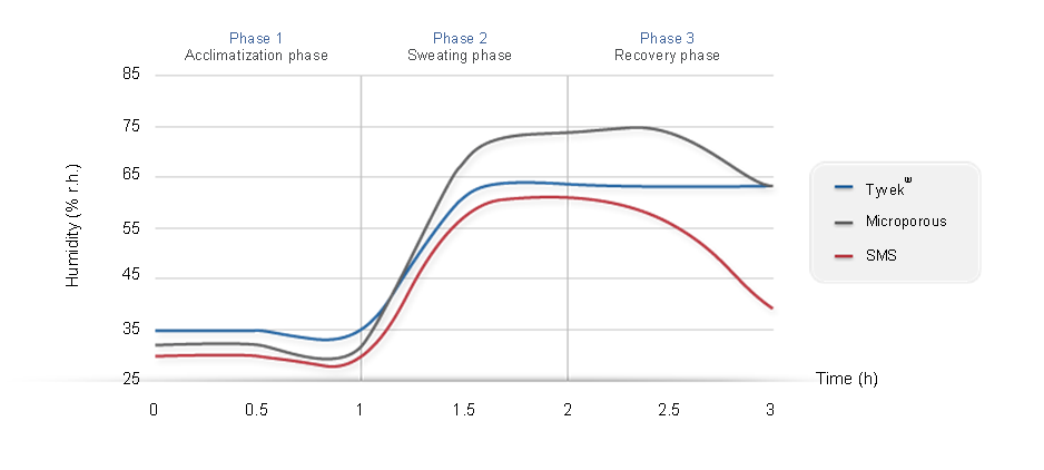 The Tyvek® barrier fabric from DuPont™ uses a proprietary non-woven fabric structure to provide a protective fabric that actually allows moisture vapor to pass through. The material is formed from High Density Polyethylene (HDPE) ultrafine continuous fibers which are laid down into a tough, light, homogeneous fabric with inherent vapor breathability characteristics on account of its microscopic lattice structure. This inherent ability to evacuate body moisture results in greatly improved wearer comfort in many Type 4, 5 and 6 applications. With their open structure, SMS coverall removes better the humidity than Microporous Film, by far. Tyvek® meets quite good performances during sweating. Microporous Film is the material that takes the longest time to remove humidity.