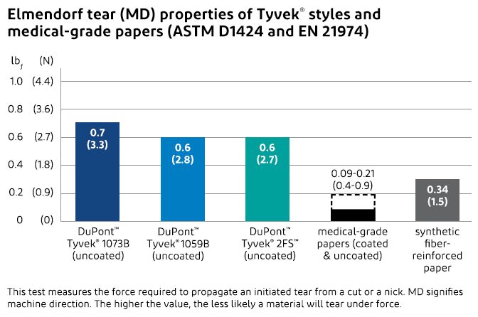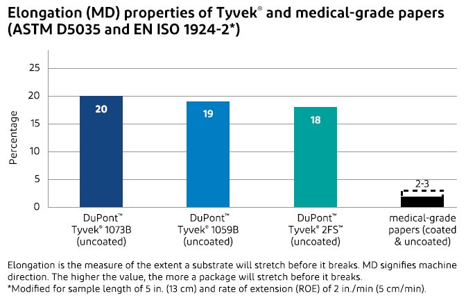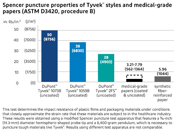 The tough, continuous filaments of Tyvek® protect packages from product breakthrough and also from penetration by an object outside the packaging during rough handling. Compared to medical-grade papers, Tyvek® has superior puncture resistance and tear strength, which means that Tyvek® does not puncture easily and tears do not readily propagate if a package is nicked.