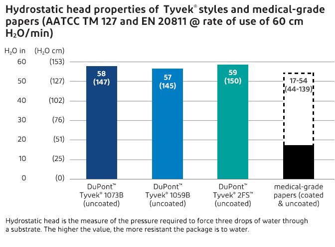 Tyvek® has superior hydrostatic head properties compared to medical-grade papers. Hydrostatic head is the measure of the pressure required to force three drops of water through a substrate. The higher the value, the more resistant the package is to water.